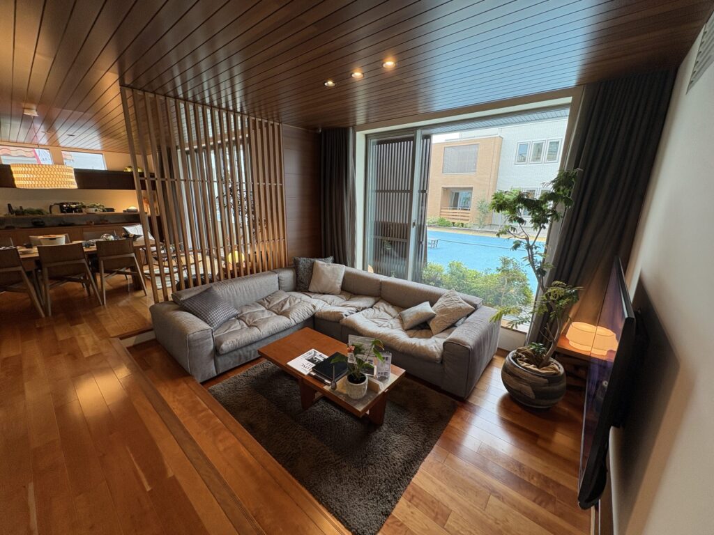 段差でリビングを下げてるのもポイントで、座ったときの安心感と天井の高さを両立できてます。