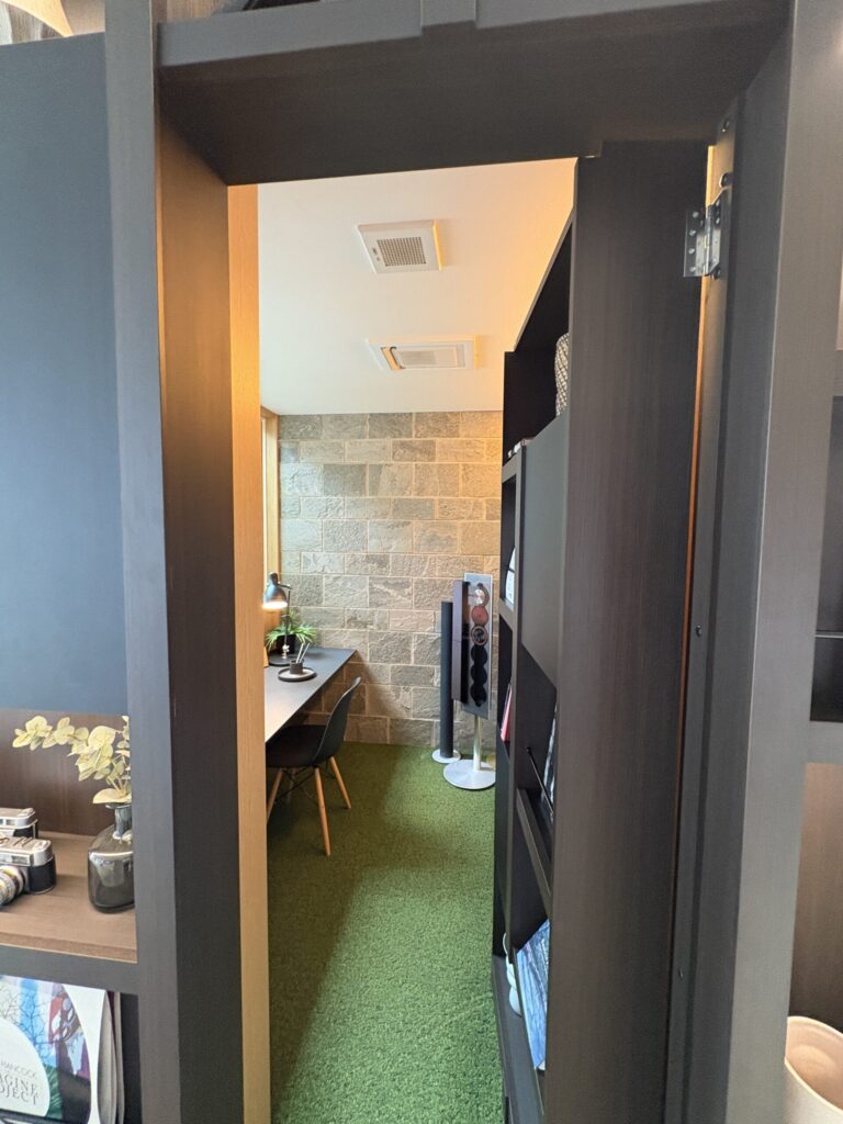 また設計士さんの遊び心で奥の書棚に隠し扉があり、奥がWORK SPACEになっていました。遊び心があり見させていただいてとても楽しい!