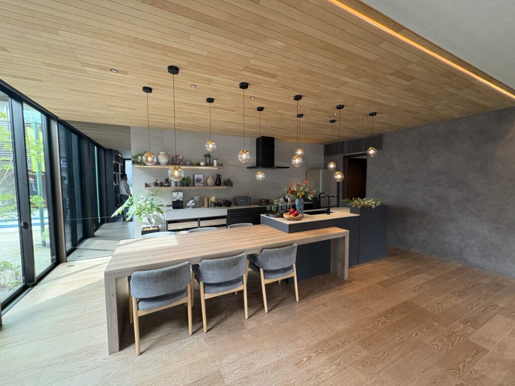 続いてキッチンですが、天井の高さと仕上げ材を変えることで、視覚的にキッチンとリビングを区切ってあり約36畳ある空間もメリハリが出ていて綺麗にまとまっています。