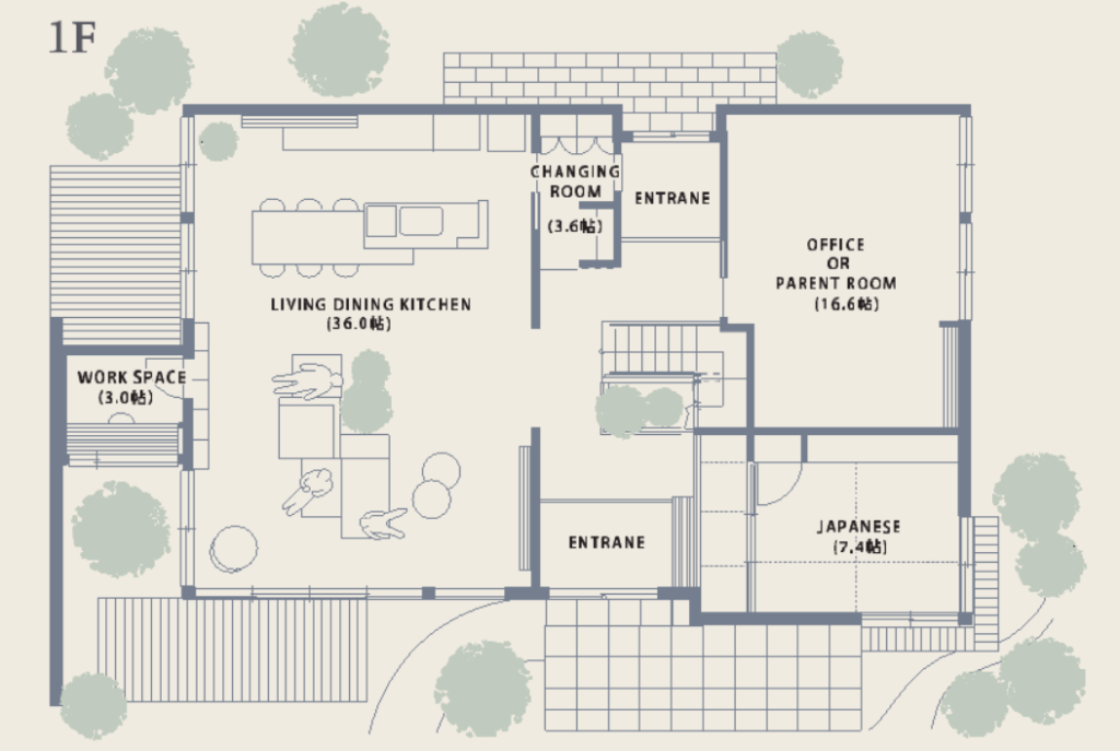 また、奥にあるCHAGING ROOMにもENTRANCEからも直接入れるようになっており、家事動線も考えられて作ってあります。
